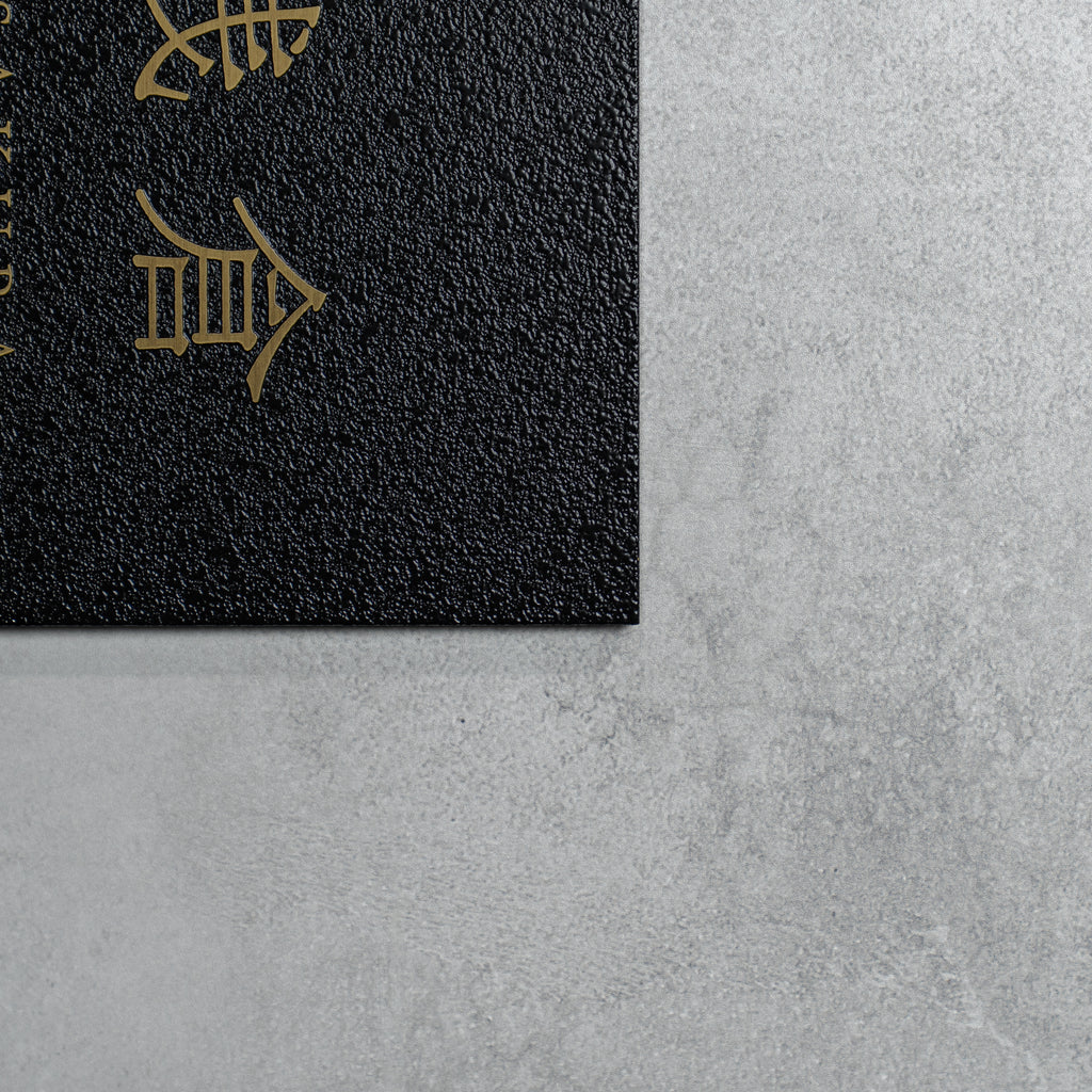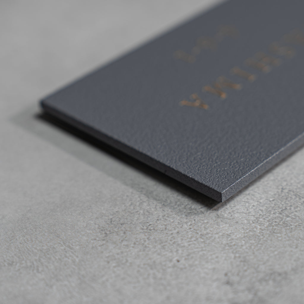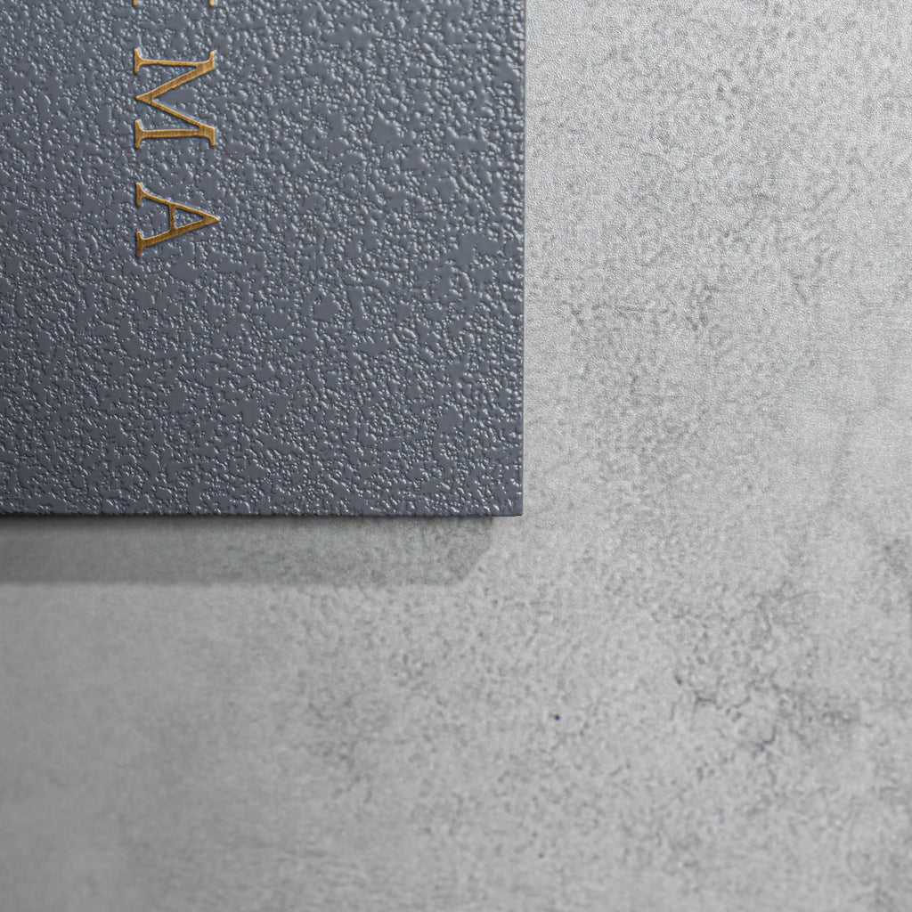表面は梨地仕上げを施すことで立体感が出て、見る角度や光の入り方によって幻想的に映ります。文字部分はエッチング加工を施すことで、真鍮の繊細で美しい輝きを際立たせ、クリアコートを施しているので比較的ゆっくりとした経年変化をお楽しみいただけます。