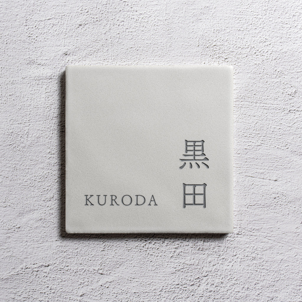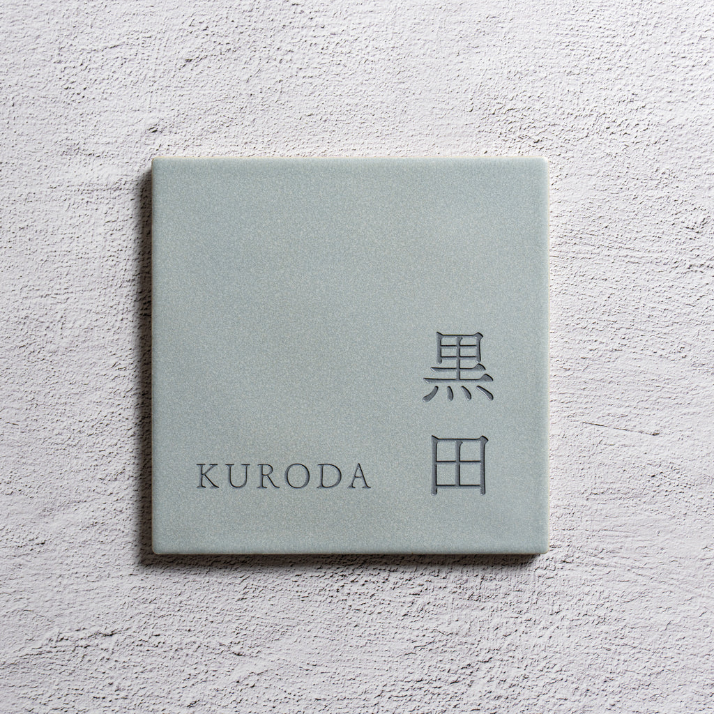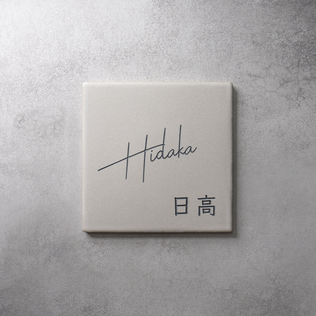 商品名:Fikaチャコール 材質:磁器タイル サイズ:W147mm×H147mm×T8mm 当店の大人気商品であるFikaシリーズ 英字のみ筆記体での依頼で製作をさせていただきました。 流行りのくすみカラーはどんな場所にも違和感なく溶け込んでくれるのでお勧めです! 漢字の部分を番地に変...
