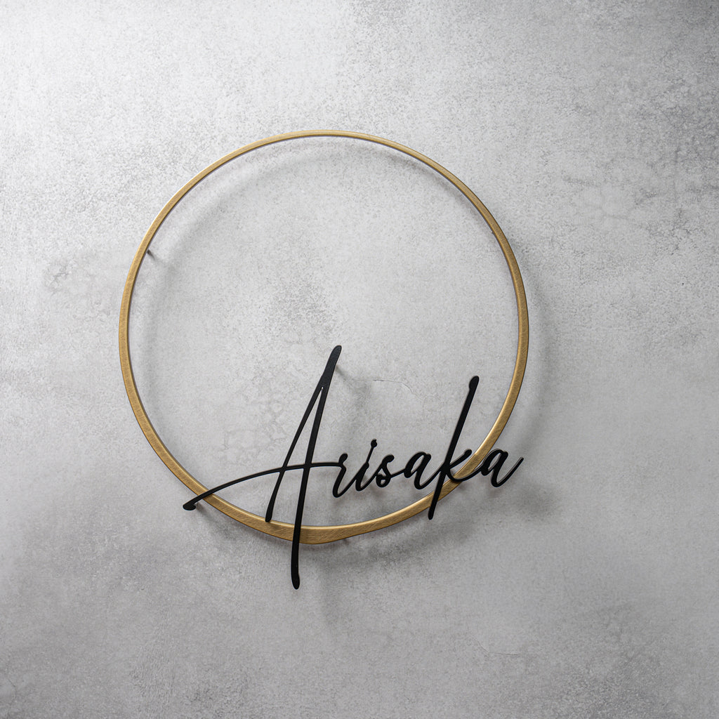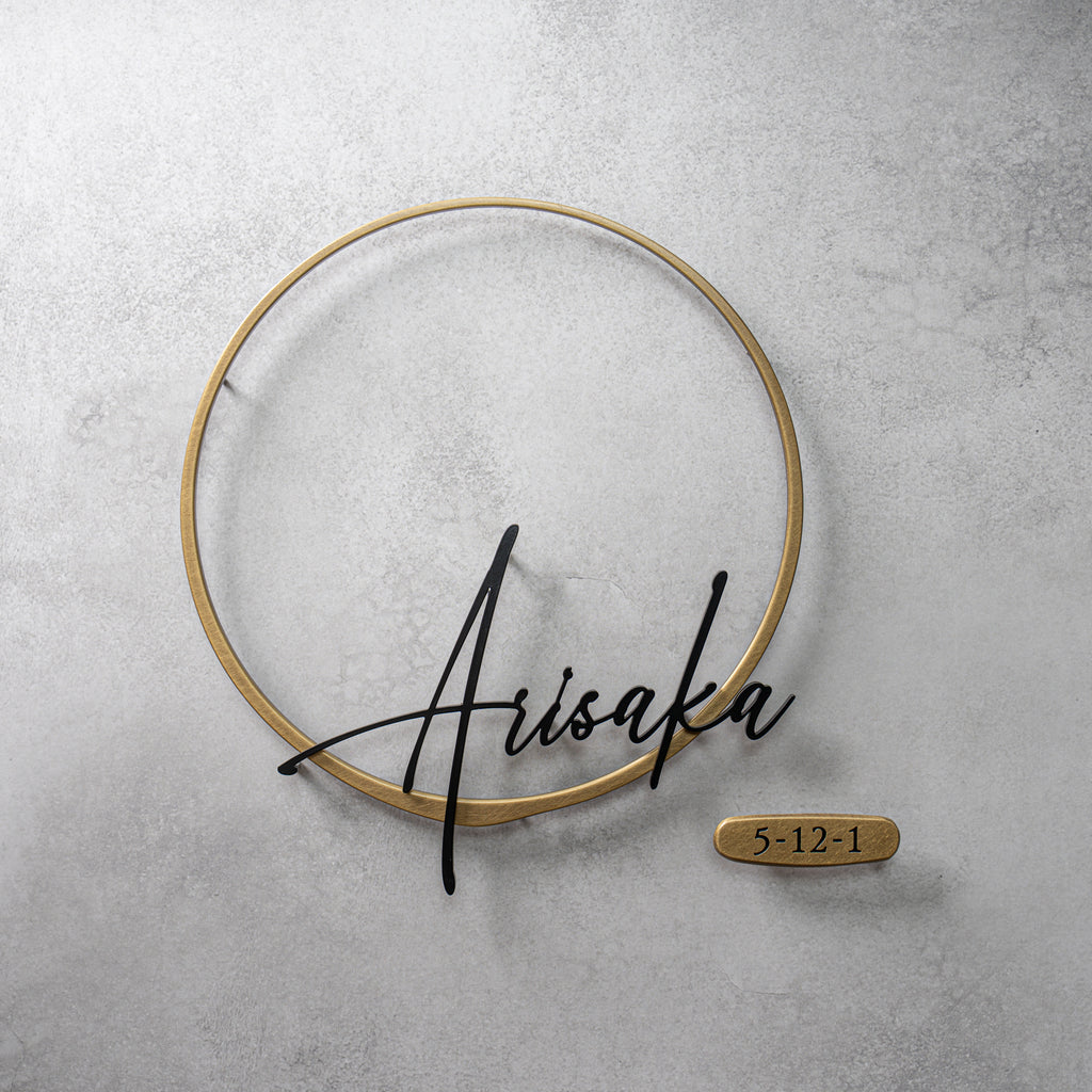 商品名:LinksB 材質:真鍮、ステンレス黒塗装 サイズ:真鍮意匠金具約W180×H183×T3mm 切文字黒塗装約W130×H86×T3mm 真鍮と黒文字の組み合わせが、お互いを引き立ててくれ、真鍮の輪と切文字は別パーツとなっており、文字の立体感がより強調される商品となっており...