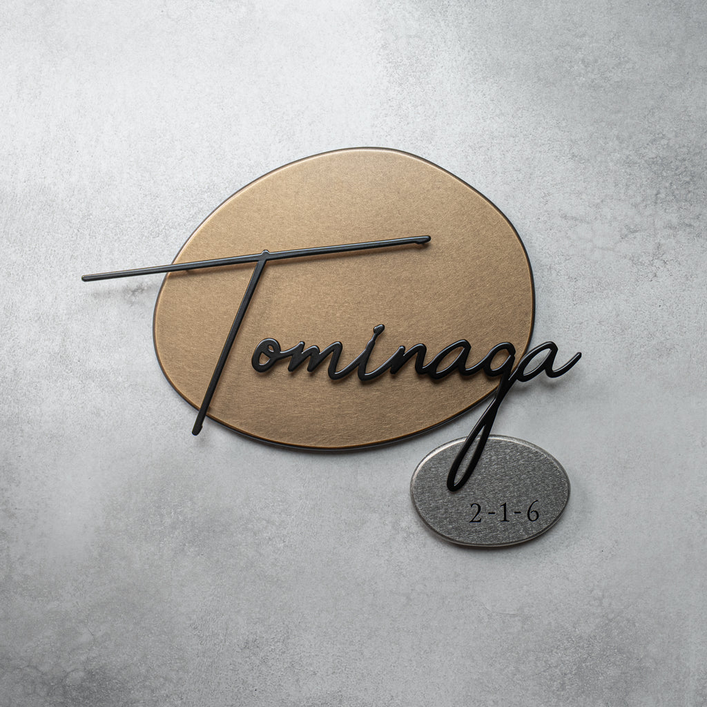 お名前の背景に無垢の真鍮を大胆に配置した「Roots C」